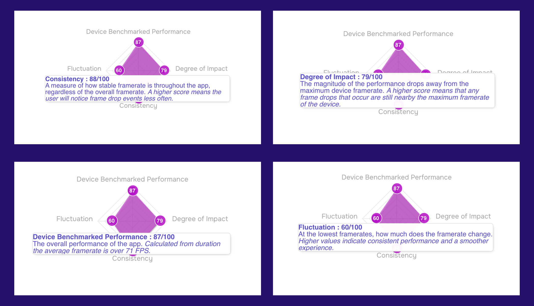A higher score indicates that any frame drops are minor and users may not even notice them, meaning the app remains smooth and comfortable even when performance fluctuates.